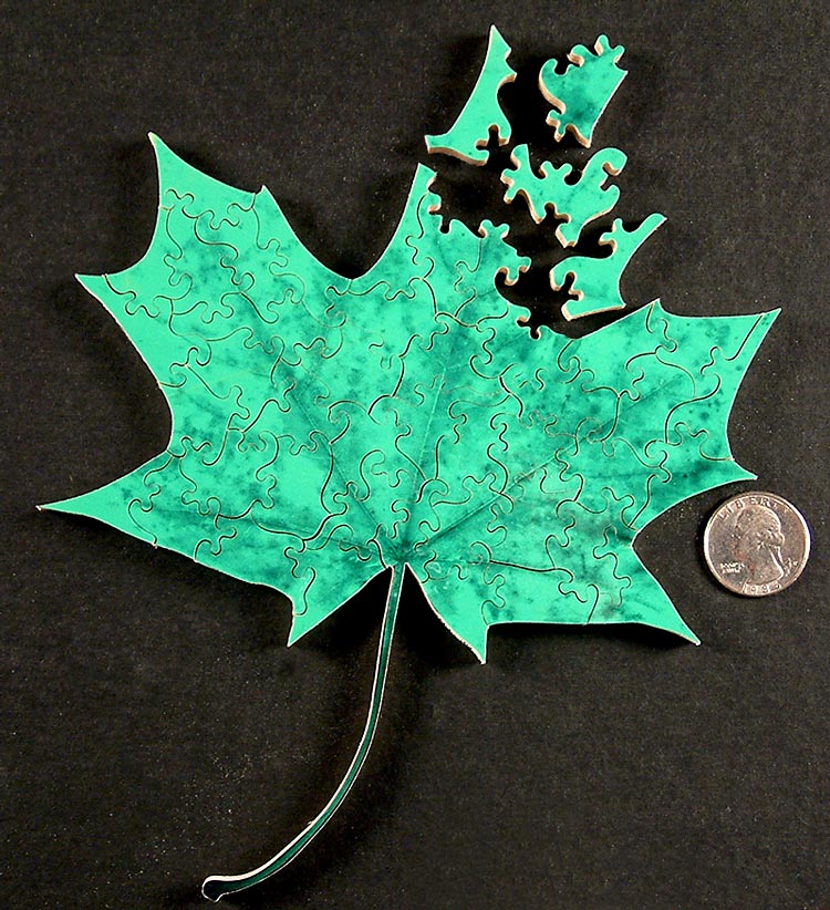 ![]() Enlarge image © Jan Good "Maple Leaf - Green" A terrific small irregular edge puzzle that will even give the most experienced puzzle lover a little trouble to solve. Some people can solve this puzzle in 20-30 minutes, but many more take 1 to 2 hours.