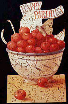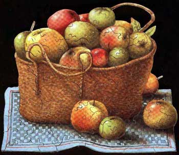 This basket of apples in an example of a middle of the road challenge with only a mild irregular edge, yet modest amount of colorline cutting. The callenge is reduced slightly due to the fact that the blue cloth and brown tight weave basket are easy to distinguish, and thus put together. None the less, it is a great example of a small, yet fairly challenging little wooden jigsaw puzzle. |