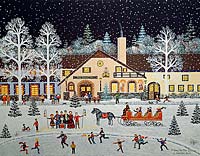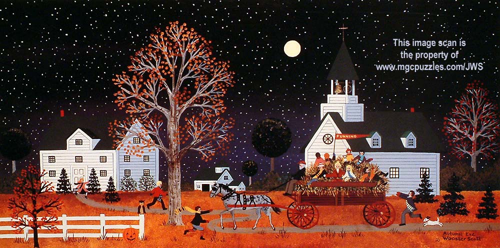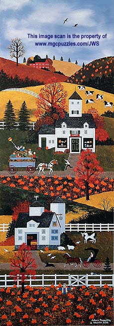 Released in 2000, this is one of Jane's first unique dimensioned prints specifically for narrow wall spaces. It is a great Autumn Scene, with lots of pumpkin patches., as well as milking Cows, a hay wagon ride, and a horse drawn carriage.