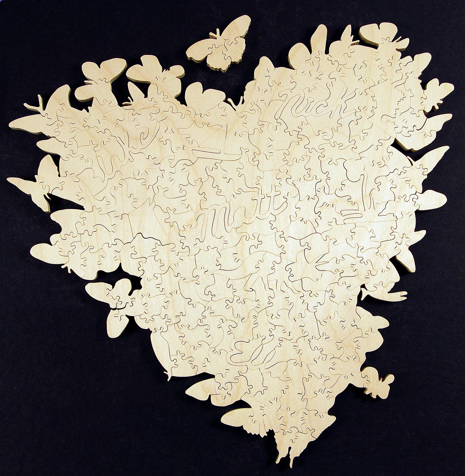 Front View ![]() Enlarge the Front of this Butterfly jigsaw puzzle A GREAT Valentine's Day gift! A cluster of lovely colorful exotic butterflies that will make a wonderfully challenging wooden jigsaw puzzle. This image lends itself to being very difficult to solve. you can order this puzzle with the solid white back ground, or I can cut it in the irregular shape of the heart, making it a smaller piece count, yet VERY challenging. My Recommendation is that you order it witht he irregular edges as pictured here. Back View ![]() Enlarge Image The image above is the Backside view of the puzzle shown ot the left. It shows you the individua detailed cuts, all made by spinning this puzzle through a saw blade as fine as hair. The highly intricate edge of the puzzle really takes solving this puzzle to another level. This is one of the more challenging puzzles that I make. It is a challenge to solve. It is best experienced in a size of 325 to 600 pieces. |