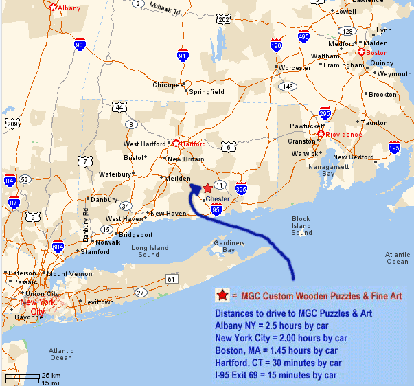If your travels place you traveling I-95 between Boston and New York, please feel free to call me in advance of your trip. I would be happy to let you tour my puzzle workshop. You can see how I make my unique puzzles, and also look at my collection of fun and colorful wooden jigsaw puzzles.
